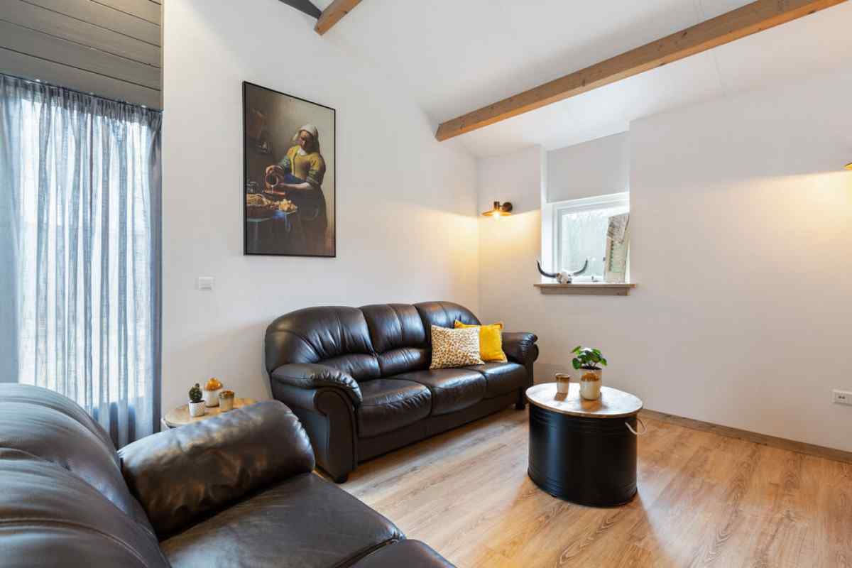 Knus ingerichte woonkamer met een eet- zithoek met TV met veel Nederlandse en buitenlandse zenders. De open keuken heeft onder andere een vaatwasser, combimagnetron, vierpits kookstel, Senseo, koelkast en een waterkoker. Er is beneden een slaapkamer met een tweepersoonsbed, en een moderne badkamer met douche, wastafel en toilet. Via een steil trappetje in de woonkamer kun je op een slaapzoldertje komen, gezien de hoogte en de trap, is het aan te raden dat hier enkel wat oudere kinderen kunnen slapen.